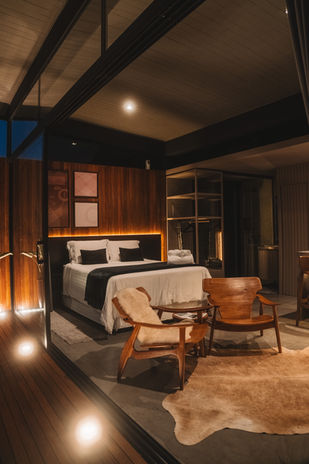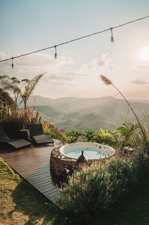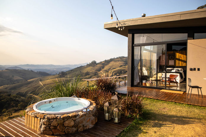 Todas as cabanas possuem vista panorâmica com quintal generoso equipado com jacuzzi ou ofurô com hidro, chuveiro externo, espreguiçadeiras e área de fogo.